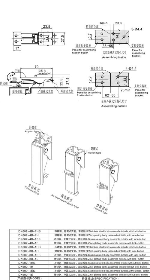 3.結構功能:翻蓋式搭扣;翻蓋通過按扭固定;通過調節螺桿可控制扣緊力;